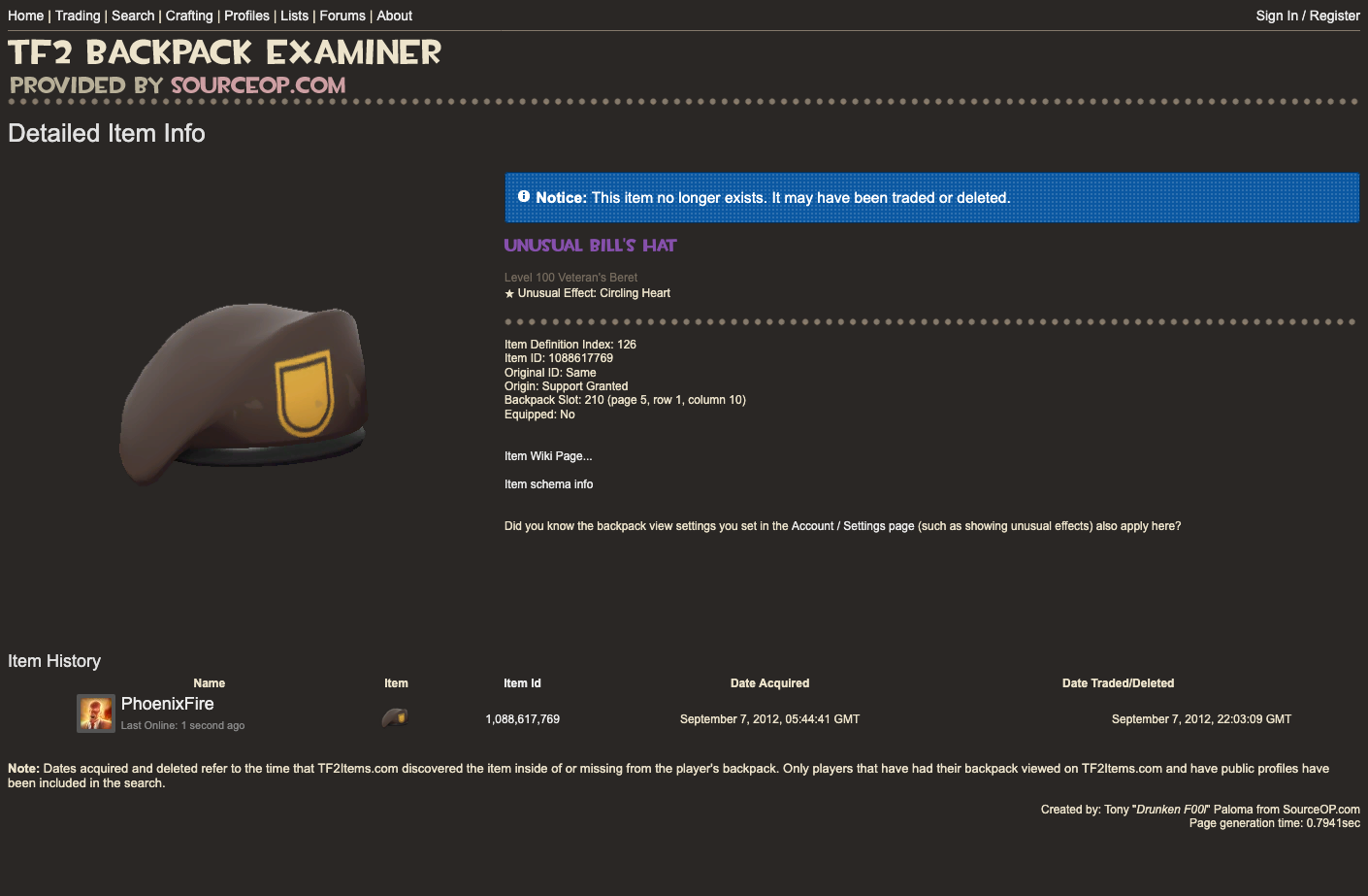 Whilst item tracking websites prove this hat definitely did exist, it's creation, and potential deletion, is still not 100% certain. It is speculated that this item was manually created by a Valve employee for his girlfriend and later wife.