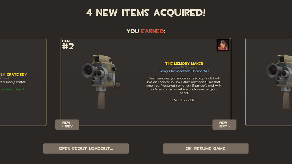 The memories you made as a Saxxy finalist will live on forever in film. Other memories—like that time you fractured some jerk Engineer's skull with an 8mm camera—will live on forever in your heart.