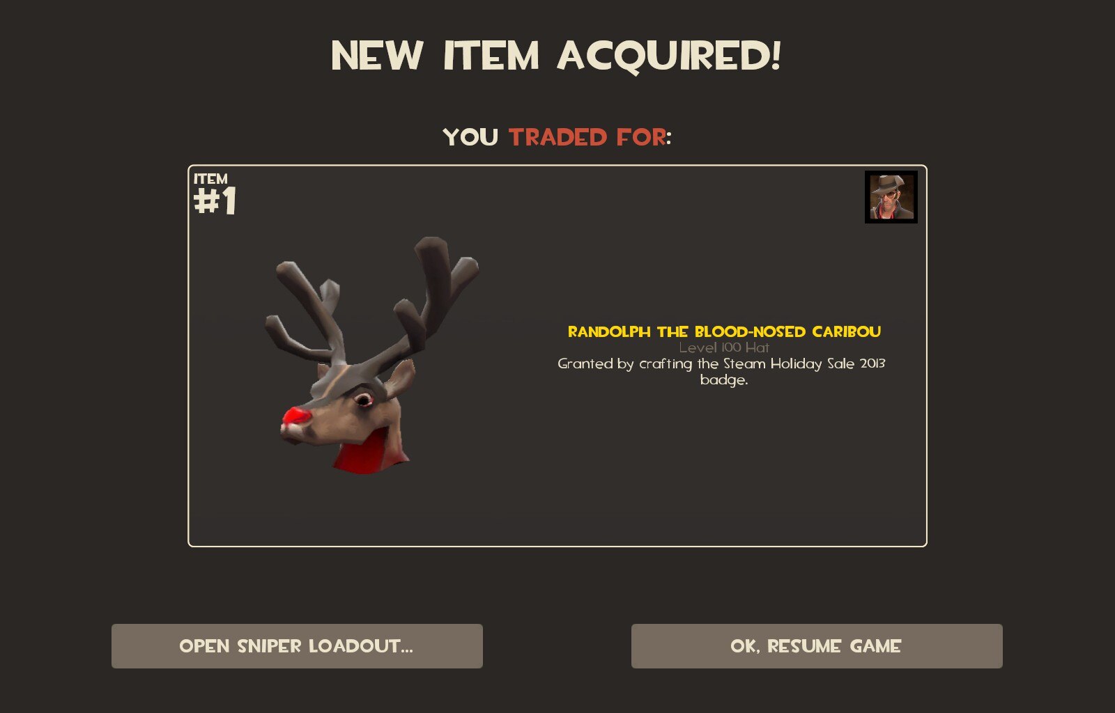 The hat was released as a promotion for the steam 2013-2014 Winter sale. The item could be unlocked by crafting all ten sale-specific trading cards together. Once all ten cards were combined, you would receive a Steam Holiday Sale 2013 badge or a free-to-play game item. Team Fortress 2 was one of the free-to-play games participating, and the 'Randolph the Blood-Nosed Caribou' was the rarest item with the lowest odds of obtaining.