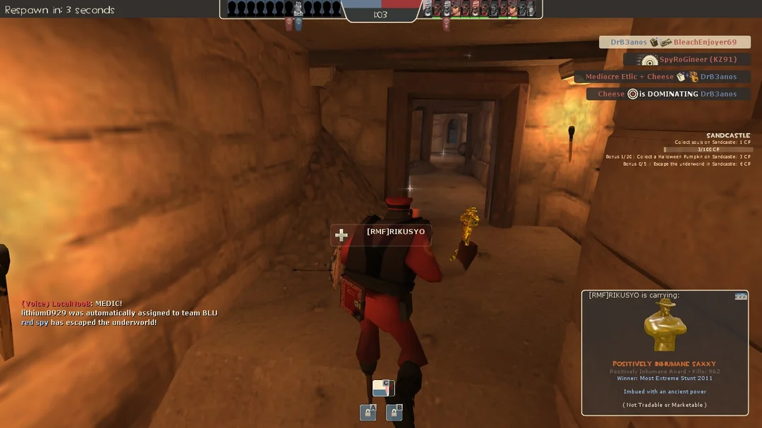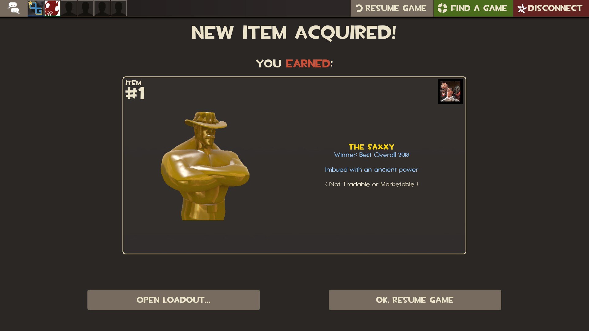 The Saxxy was awarded to winners of the Annual Saxxy Awards, a filmmaking contest hosted by Valve. Saxxys were bestowed upon all contributors in winning entries created by more than one player.