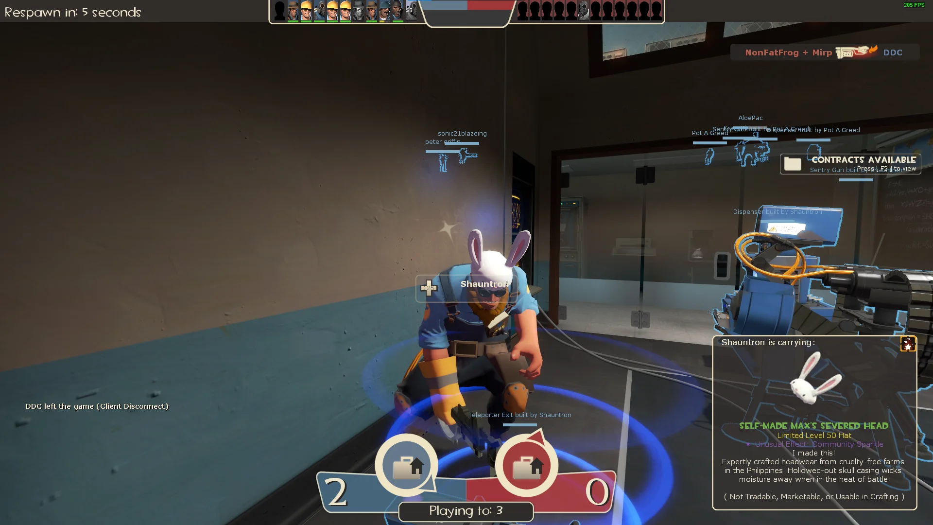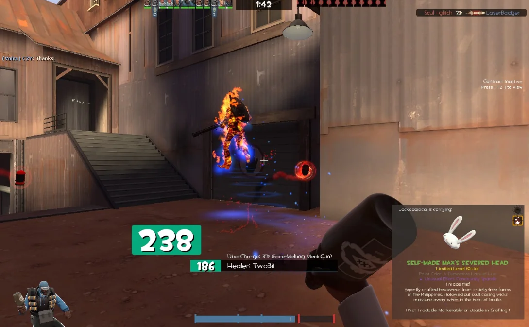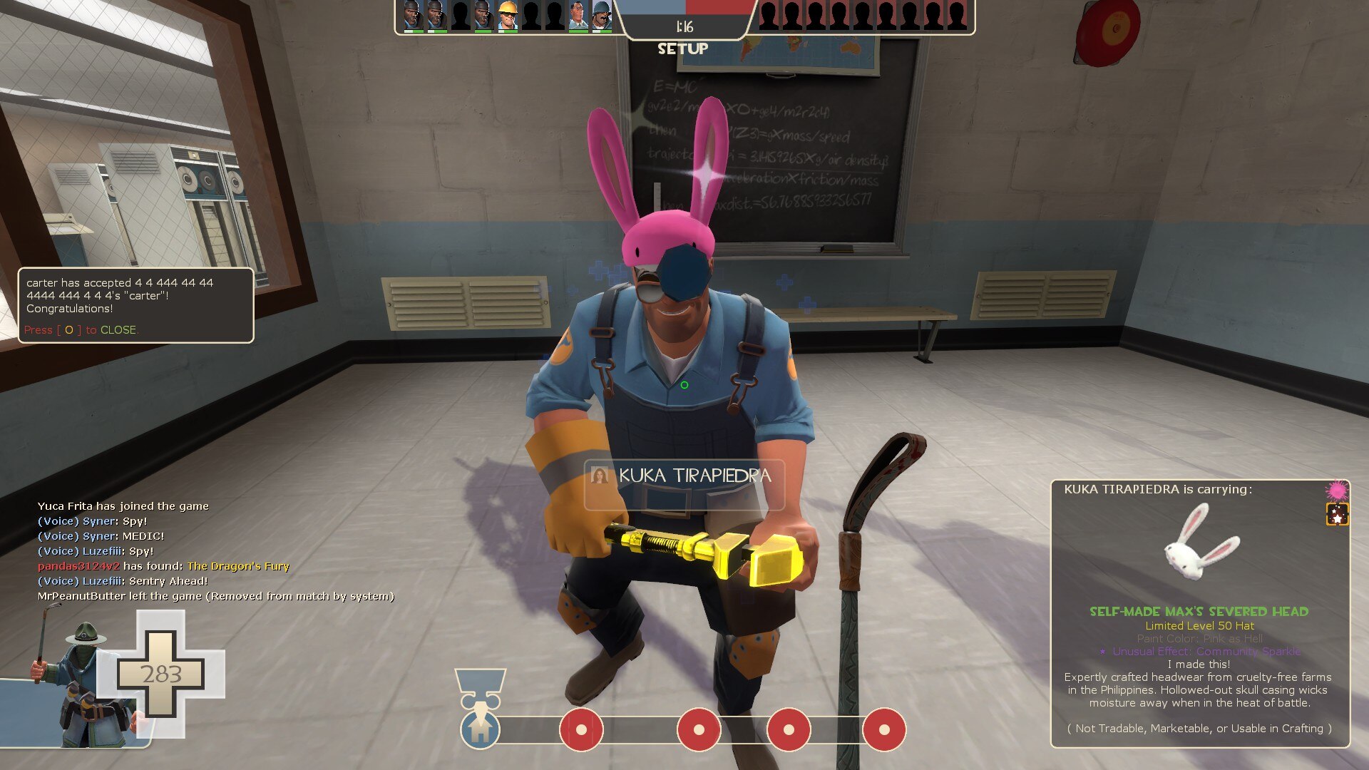 This item was awarded to the employees of 'Telltale Games', creators of the Sam & Max games, in Self-Made quality with a Community Sparkle effect and a non-tradable attribute. The employees also received a Self-Made Big Kill and a Self-Made Lugermorph (which turned Vintage by accident).