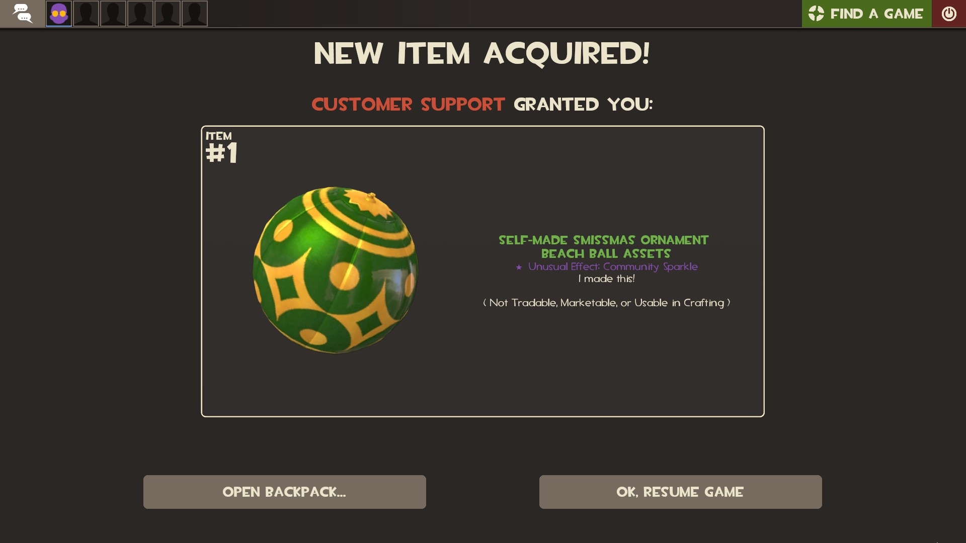 This item appears in the item schema, but is not obtainable in any way. This item has a defindex of 1200. It is a ball that can be kicked inside the spawn room.