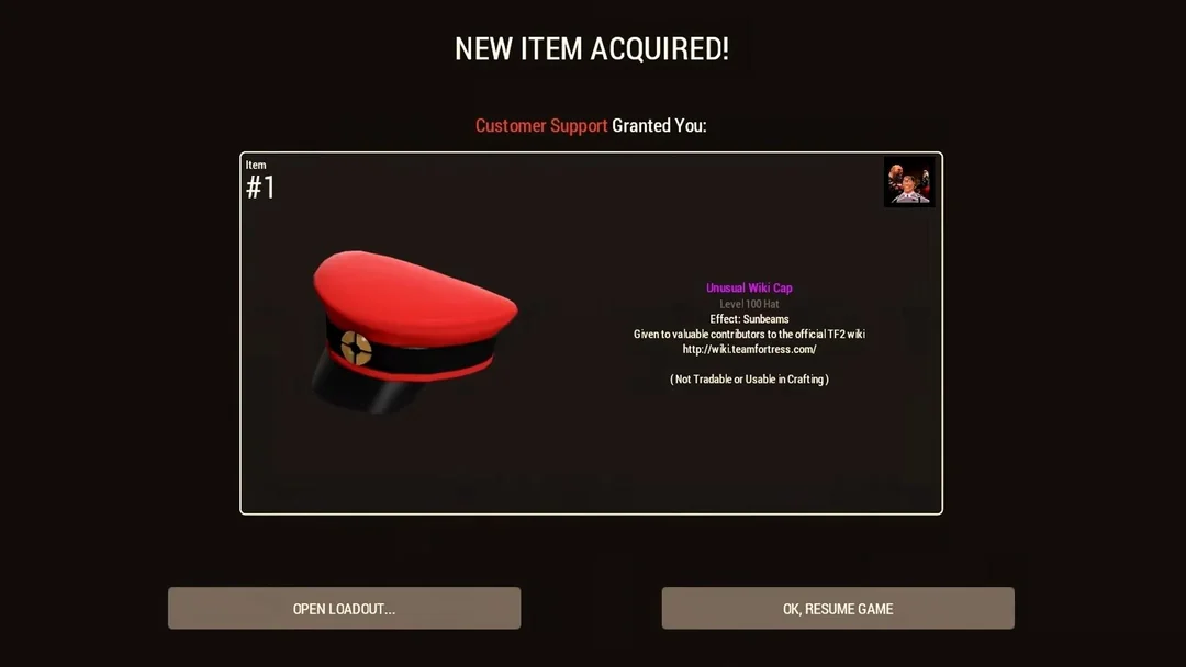 This item was awared to a person who reported a serious exploit. At the time, Valve granted a unusual of choice, so the reported opted for the Wiki Cap.