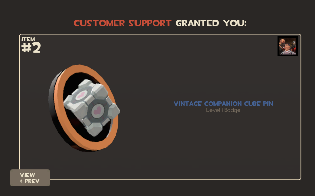 Vintage Companion Cube Pins were given to play-testers of Portal 2 at PAX 2010 prior to the item's official release.
